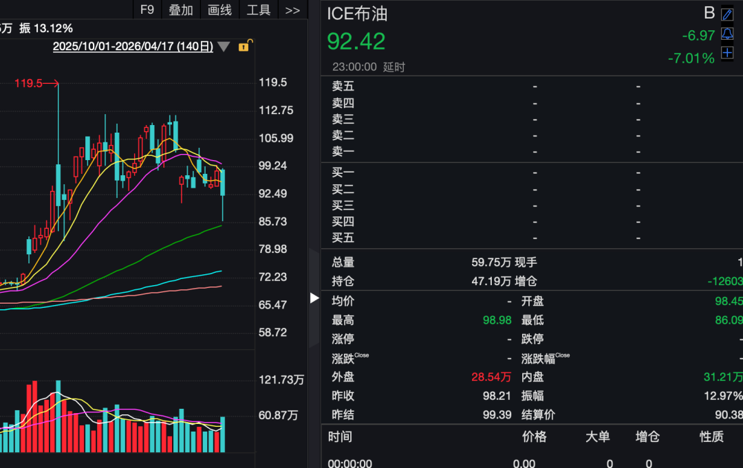 國際基準(zhǔn)布倫特原油期貨下跌7.01%,收于每桶92.42美元。