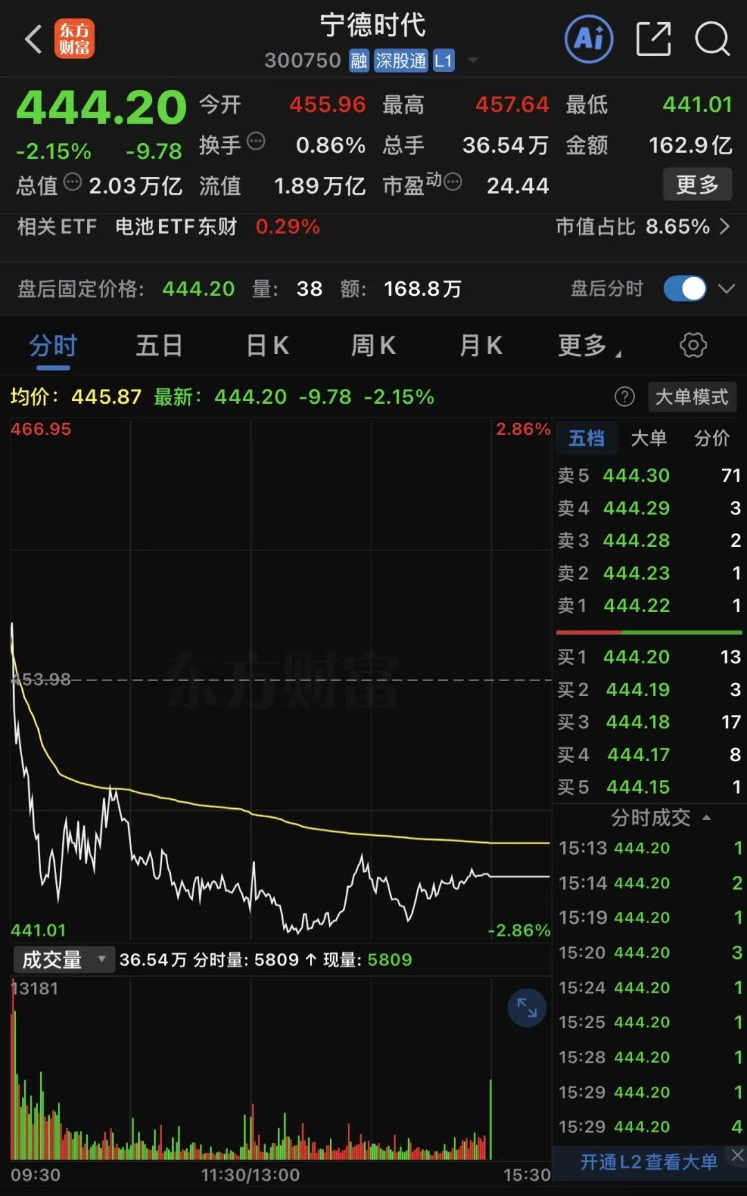 截至4月17日收盤,寧德時(shí)代報(bào)收444.2元/股,當(dāng)日下跌2.15%,成交額163億元,總市值約20274億元。今年以來,寧德時(shí)代股價(jià)上漲20.95%。